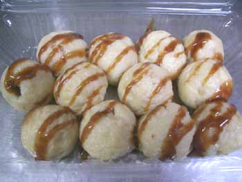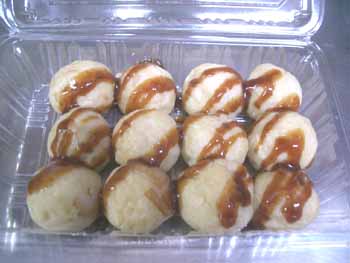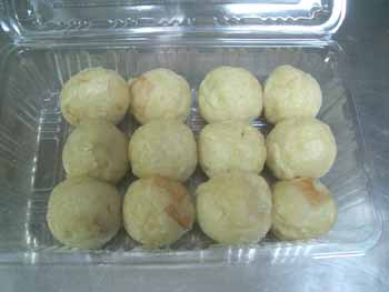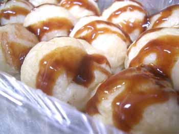 | 一応、パックに入れてみました。 (パックは、100円SHOPで16パック入) 試作段階なので、 たこ焼きと市販ソース(イカリたこ焼きソース)のみ |