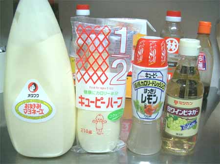 | 「白ワインビネガー」は、香りが強すぎてダメ〜! 「レモンドレッシング」は、よさげでしたが、 ちょっと柑橘系が強くて難しそうです。 「キューピーハーフ」は、 正式には「サラダクリーミードレッシング」だそうで、 マヨネーズ独特のアクの強さがなく、結構使えそうです。 |