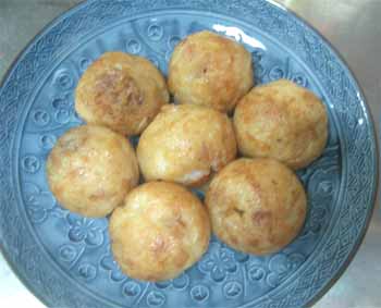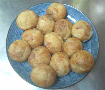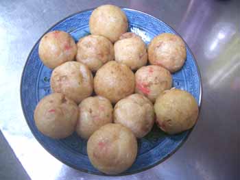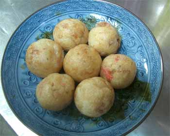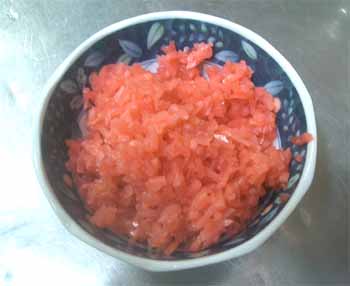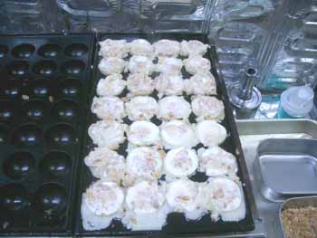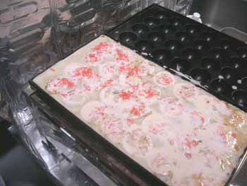 | 2回目は、市販の粉ではなく、今までの材料を使い、 「紅しょうが(みじん切り)」を加えてみました。 出来上がりのタコ焼に赤いアクセントがついて 見た目はイイですネ。 入れる紅しょうがの量にもよるのでしょうが、 紅しょうがの味がちょっと強い気がしました。 紅しょうがが好きな人はイイのでしょうが、 ちょっと苦手な人には向かないですネ。 |