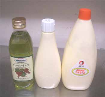 | 現時点のマヨネーズの材料です。 キューピーのハーフハーフ オタフクのお好みマヨネーズ(カラシ入) グレープシードオイル |