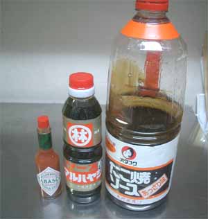 現時点のソースの材料です。 オタフクのタコ焼ソース(あっさり) マルハヤシのウスターソース タバスコ (注)タバスコは苦味がでてしまうので 現在は入れてません。 |